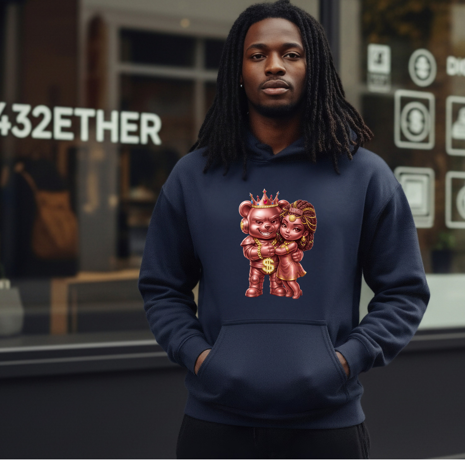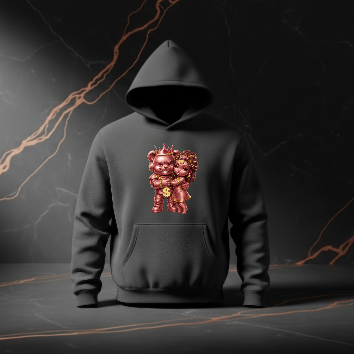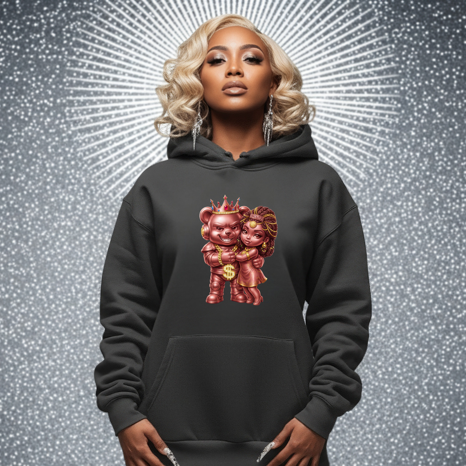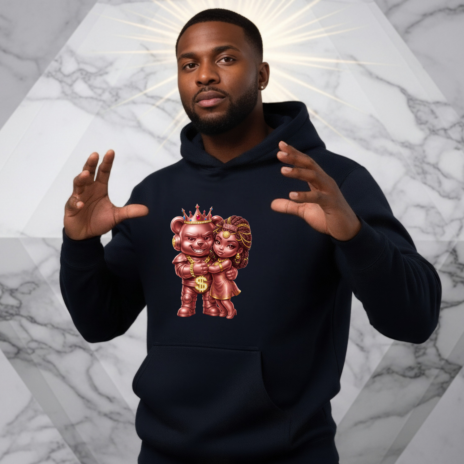 Printed on a premium medium-heavy hoodie, the smooth cotton-poly blend enhances every detail: the metallic reflections, soft gradients, jewelry textures, and the duo’s sculpted forms. Warm, durable, and visually stunning — this is a statement piece for anyone living in their King or Queen era.