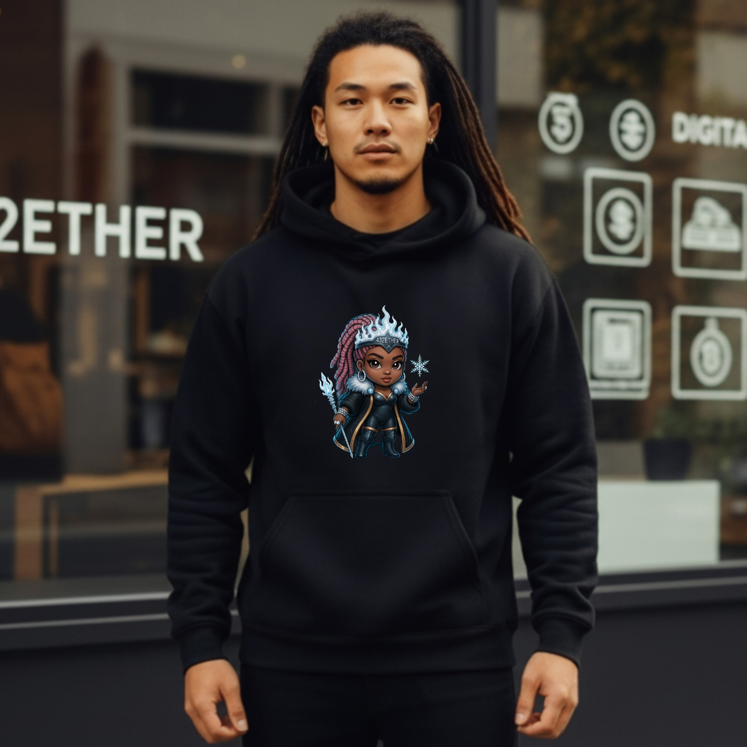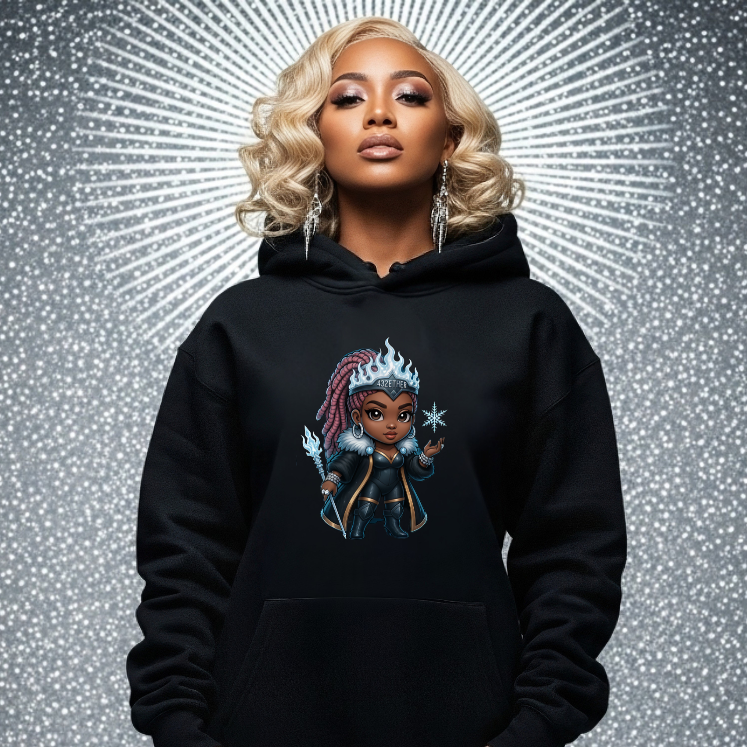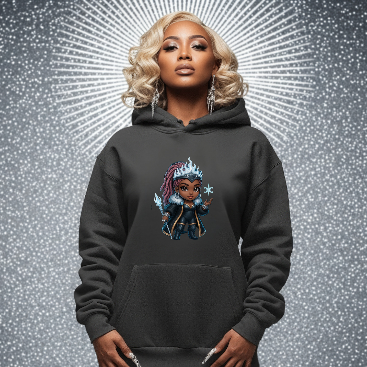 Rendered in high-definition color and sculpted detail, the artwork prints beautifully on premium fabric, showcasing the icy glow, metallic textures, and chic winter palette. This hoodie is perfect for cold-weather outfits, holiday-season flexing, cosplay-style streetwear, or anyone channeling their Ice Empress Era.