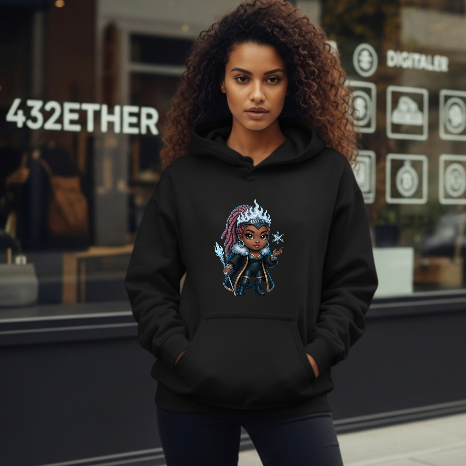 Channel the cold beauty and unstoppable power of winter with the 432ETHER “Ice Empress” Hoodie — a striking character design that blends fantasy royalty, and elevated frequency energy.